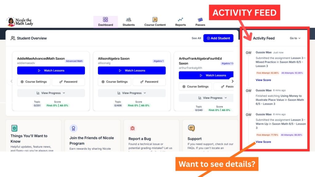 Want a quick update at a glance? On the far right of your Parent/Teacher Dashboard, there is a handy dandy Activity Feed where you will see a quick list of the latest activity from your students. It provides an easy snapshot of what has been most recently completed. You can also click âView Scoreâ for more details on a specific activity and there is also a convenient drop-down âGo Toâ menu that takes you directly to each studentâs overview.