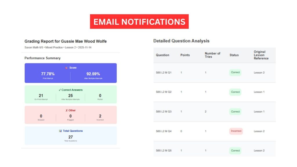 Need to know whatâs happening while youâre on the go? If you sign up for Email Notifications, you will receive an email as soon as your student submits an assignment for grading. Not only will the email alert you to the fact that your kiddo completed their assignment (yay!) it will also include: