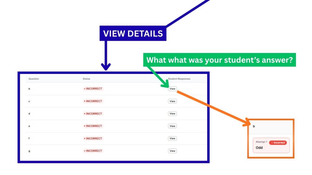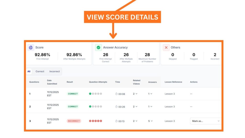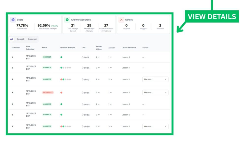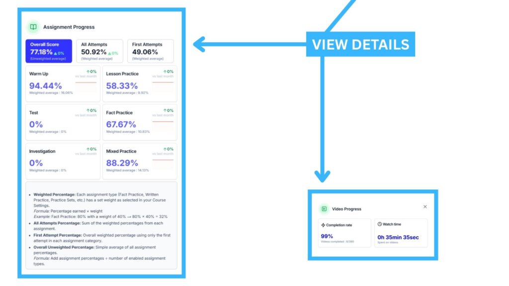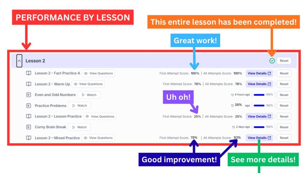 Want to see a detailed look into a specific assignment? You can find Performance by Lesson immediately below your studentâs Overall Progress. At first glance, you can immediately see which lessons have been completed, which are in progress and which have not been started. And, by clicking a lessonâs little arrow, you will find a list of every task for that lesson. The status of each task is clearly listed and when you click âView Detailsâ for a completed assignment, you will find a plethora of details for each question! Not only will you see whether your studentâs answer was correct, youâll see how long it took for them to answer it, if they attempted the question more than once and even exactly what they entered for their answer!