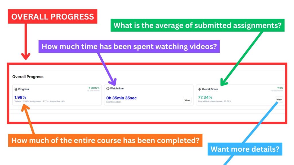 Want to see the big picture? Your studentâs Overall Progress offers a succinct layout of some helpful information including the percentage of the course completed, the amount of time spent on watching videos and an overall score for the entire course. Overall Progress can be found by clicking on âReportsâ.