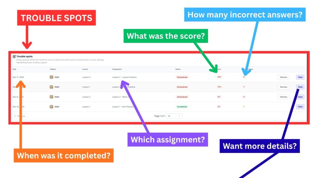 Need some insight into problem areas? Trouble Spots is a feature that identifies which specific assignments your student needs help with. You can easily access your studentâs Trouble Spots from your Parent/Teacher Dashboard and will find everything you need to know about assignments that warrant some additional attention from you. For more info on how to access and make the most of this feature, check out Trouble Spots – How to Quickly Identify Where Your Student Needs Help.