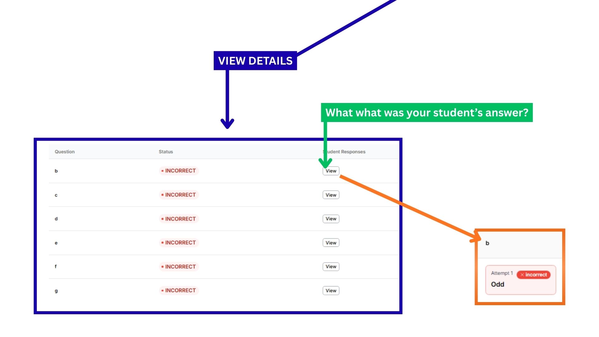 - Incorrect? Click View Student Response to see the answer that was submitted. Based on their answer, you could do a few different things:
